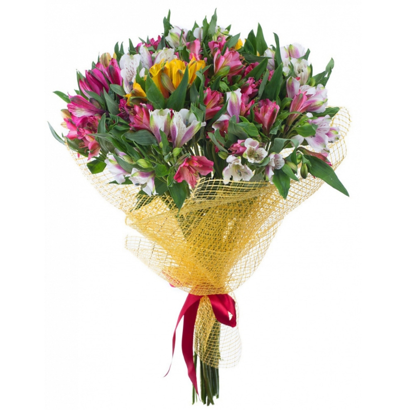 Букет состоит из MIX из 17 альстромерий, зелень, сетка, атласная лента.